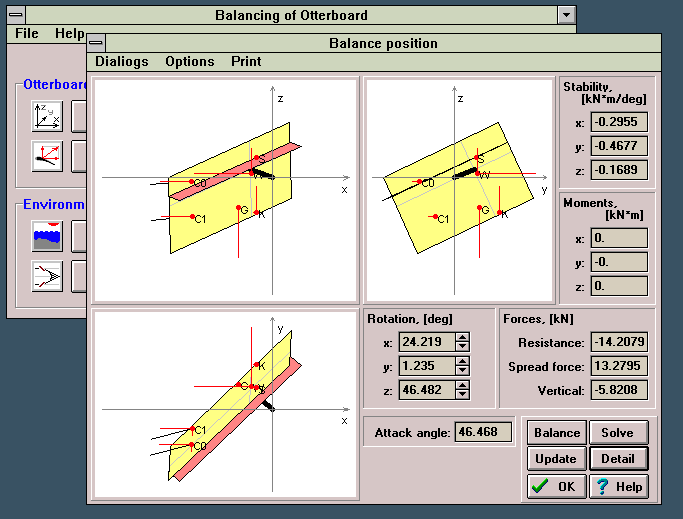 The Program "Balancing of Otterboards" calculates equilibrium position in a flow. Equilibrium position is determined by the angles of turn around the axes of coordinates, connected with the flow (an attack angle around the vertical axis, a trim angle around cross-axis and a heel angle around longitudinal axis). An equilibrium position is a position in which the sum of all moments of acting forces is equal to nil.