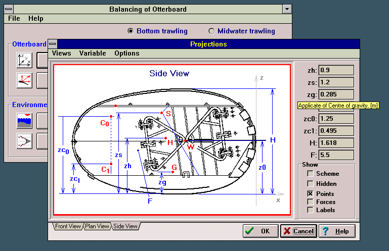 Balancing of Otterboards The Program "Balancing of the Otterboards" has been produced to allow design and adjustment of otterboards while fishing. It enables the calculation of the equilibrium position of a bottom or pelagic otterboard in specific fishing conditions. | ![]() |
