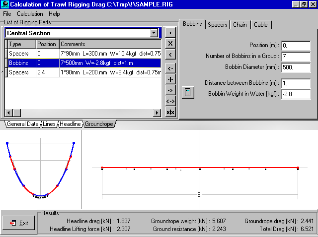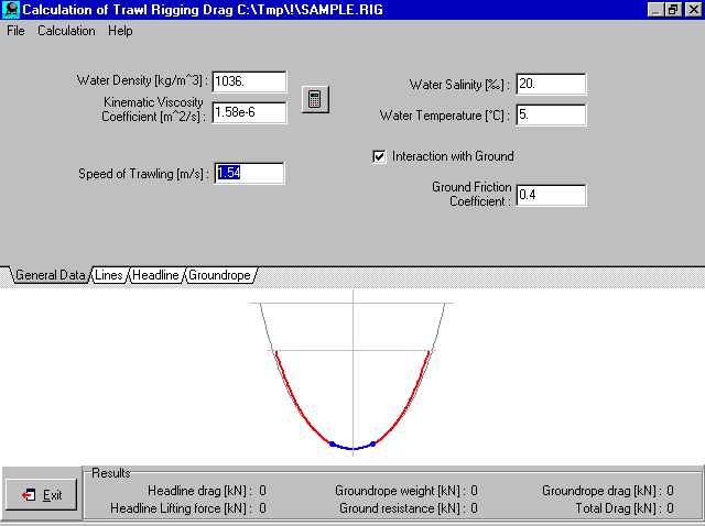 resultant lifting force for a headline and the resultant weight in water for a footrope or a groundrope.The Program can be used by fishing gear designers and manufacturers during creation of new trawls. The