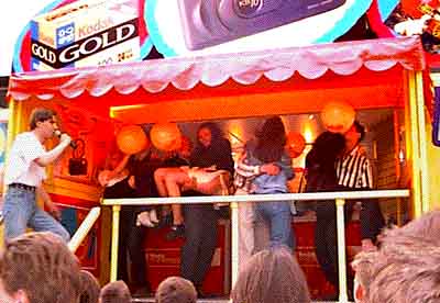 Это всё тот же, упоминавшийся в страничках о открытии автопоезд Kodak. Идет конкурс "кто держа девушку, быстрее надует шарик до полного его лопания". Кстати этот же веселый автопоезд проводил конкурс Мисс Kodak-Калининград. Девушек дл награждения вызывали называ номера:
